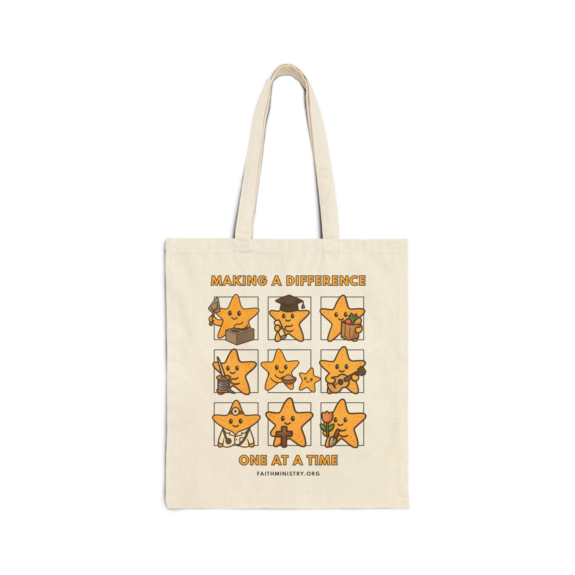 The tote is 15"x16" and made from 100% durable cotton canvas for long-lasting use
